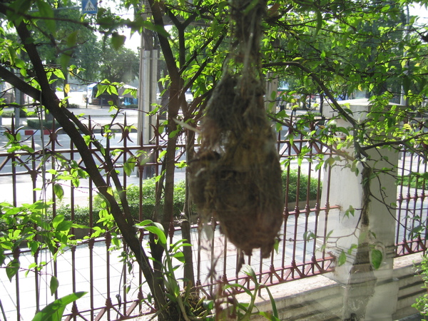 這家店的落地窗外面有好幾個鳥巢